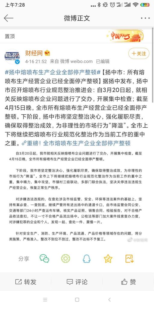 國(guó)家出手總是那么及時(shí),這兩天國(guó)內(nèi)部分地區(qū)集中整頓熔噴布市場(chǎng)上了熱搜,國(guó)家已經(jīng)開(kāi)始整治熔噴布亂象了,下一步,安評(píng)、環(huán)評(píng)、衛(wèi)生一卡可能好多小工廠都不能生產(chǎn)了,已經(jīng)能看到有小作坊甩賣(mài)生產(chǎn)線(xiàn)的了,對(duì)應(yīng)的那些手續(xù)齊全標(biāo)準(zhǔn)要求嚴(yán)格的企業(yè)則會(huì)更加如魚(yú)得水,熔噴布整治短期內(nèi)價(jià)格不好降,有兩級(jí)分化的可能,但短期內(nèi)大幅降價(jià)幾無(wú)可能。